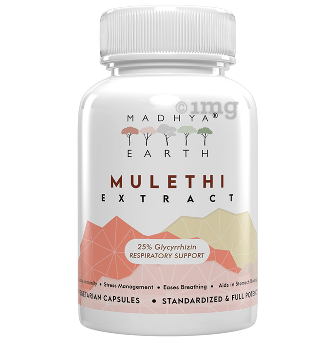 Madhya Earth Mulethi Extract Vegetarian Capsule contains the goodness of glycyrrhizin, a natural expectorant that clears mucus from the lungs and helps easy breathing. Mulethi Extract also aids in digestion and keeps the stomach free from bloating.