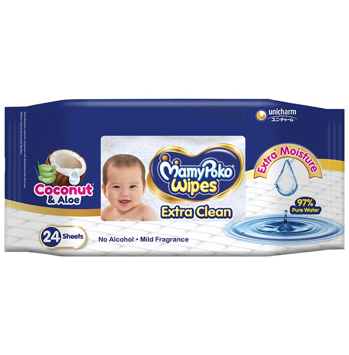 MamyPoko Extra Clean Wipes effectively clean your baby's skin. These wipes feature a unique thick crisscross sheet with extra moisture content, now enriched with the goodness of both Aloe Vera and Coconut Essence, to clean and soothe baby’s skin while keeping it soft and fresh.