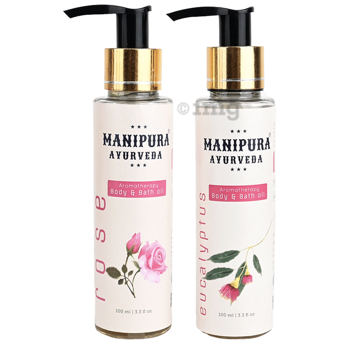 Manipura Ayurveda Combo Pack of Rose & Eucalyptus Aromatherapy Body & Bath Oil is an organic aromatherapy bath and body oil made with oils like olive oil, sesame oil, coconut oil, and almond oil, along with pure essential oil. Working as both body oil and moisturiser. It is pure and gentle; it is a delight for your senses and provides intense moisturisation, making it a perfect choice for dry skin. It boosts vitality, soothes senses and regenerates skin tissues. This deeply moisturising body oil works excellent as an after-bath body oil or bath and body oil and helps you relax the body. It is made from olive oil, sesame oil, coconut oil, almond oil, and pure essential oil. It helps to minimise signs of ageing, boosts collagen and glides deep into the skin for healthy and intense nourishment. The body oil is infused with cold-pressed sweet Almond oil, which is loaded with vitamin E and works on revitalising skin and replenishing skin's natural moisture. It is made consciously without toxins like sulphates, parabens, formaldehyde and mineral oil; the deep moisturising body oil provides a layer of ultra-rich moisture, protects the skin from damage, soothes your skin senses and is pure above it all. This body oil has not been tested on animals and is free from chemicals.
