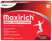 Maxirich from Cipla Multivitamin & Minerals Softgel contains an essential blend of more than 13 minerals and vitamins that are beneficial for the body. It helps to manage appetite and support the nutrition gap in everyday diet. Vitamins and minerals help cells and organs to perform their normal functioning. Regular consumption supports the body’s metabolism, immune system, nervous system, brain function and energy production.