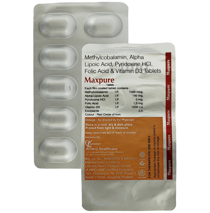 Maxpure Tablet contains Methylcobalamin, Alpha Lipoic Acid, Vitamin D3, Pyridoxine & Folic Acid as its active ingredients.