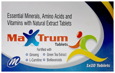 Maxtrum Tablet is a dietary supplement with essential minerals, amino acids, vitamins and natural extracts that support overall health. It provides essential nutrients to the body and supports bodily functions. Vitamins are involved in energy production, immune function, cell growth and repair, and various other physiological processes.