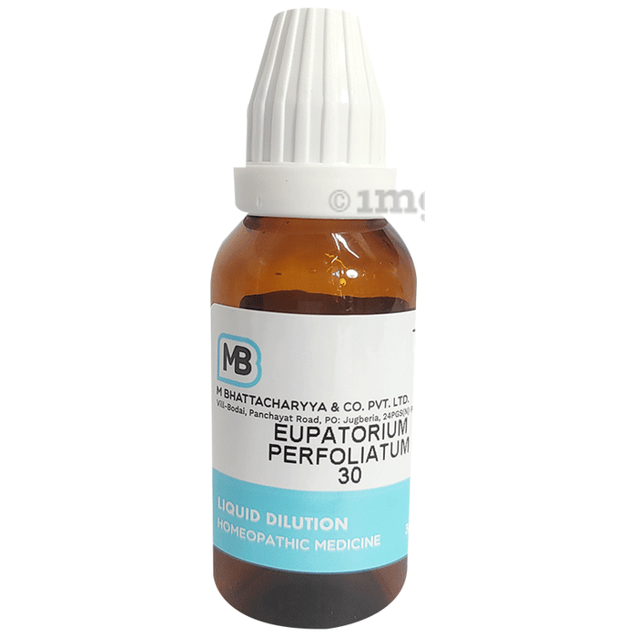M Bhattacharyya & Co Pvt Ltd Eupatorium Perfoliatum Dilution 30 is a homoeopathic remedy traditionally used to support musculoskeletal comfort and ease symptoms associated with high body temperature. It is especially helpful for managing general soreness and respiratory wellness.