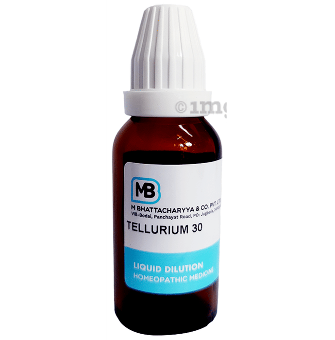 M Bhattacharyya & Co Pvt Ltd Tellurium Dilution is a homeopathic solution prepared from Tellurium. It is utilised for various health concerns, including skin disorders, body pains, and ear and eye ailments. This dilution is formulated following homeopathic principles to ensure quality and efficacy. Consult a healthcare professional for appropriate usage.
