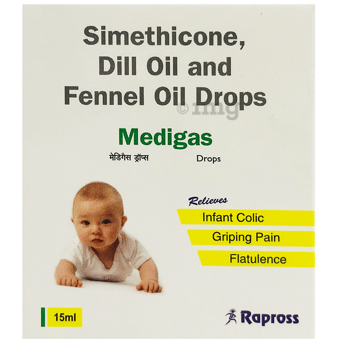 Medigas Drops contains Simethicone, Dill Oil and Fennel Oil.