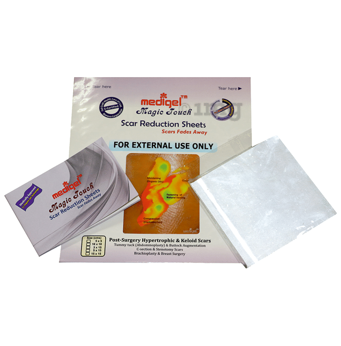 Medigel Scar Reduction Sheet 1 X 2 Inch helps in the skin's natural healing by fading off scars, and its gel sheet aids in the fast recovery of wounds. Its elastomeric compression aids in reducing hypertrophic and keloid scars.