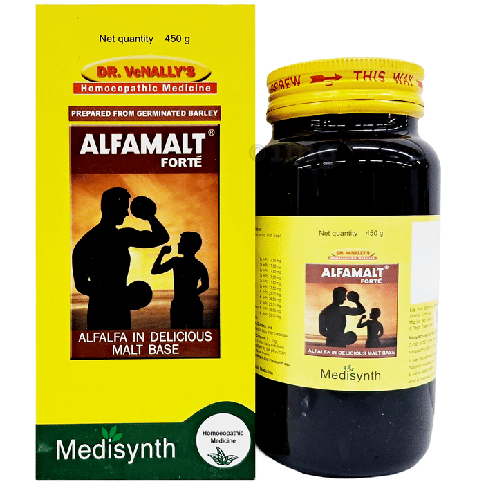 Medisynth Alfamalt Forte Malt is a homeopathic malt-based supplement formulated with alfalfa and other potent ingredients in a delicious malt base. Ideal for underweight children and adults with poor appetite, this product can help support growth and overall well-being. The combination of ingredients is prepared meticulously to help improve appetite, provide essential nutrients, and promote a balanced, healthy diet. The germinated barley used as a base enriches its nutritional value, making it an excellent choice for individuals needing additional nourishment.