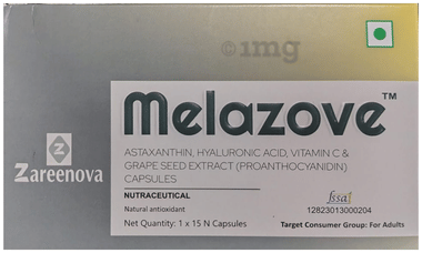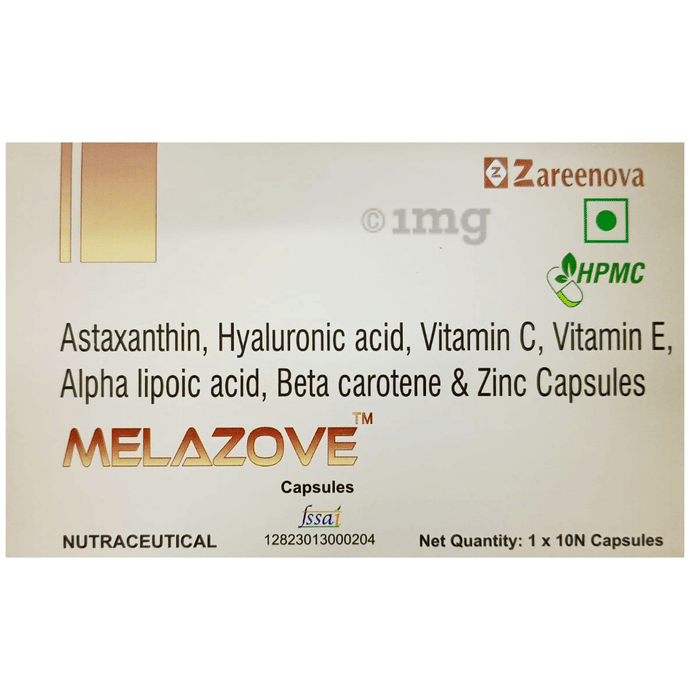 Melazove Capsule contains a blend of antioxidants, vitamins, minerals, and hyaluronic acid designed for individuals who want to maintain skin hydration, brightness, and overall dermatological nutrition. This combination supports routine skin wellness, especially for those experiencing dullness, uneven tone, or increased oxidative stress due to lifestyle or environmental factors.