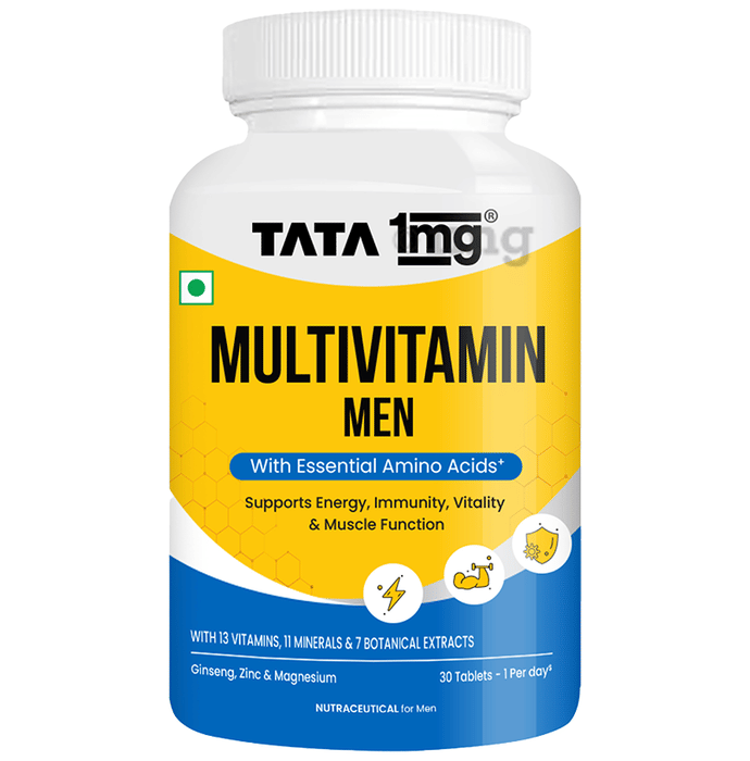 Tata 1mg Men's Multivitamins are specially formulated with 13 essential vitamins, 11 minerals, and 7 botanical extracts. Ideal for active men, this multivitamin supports energy, immunity, vitality, and muscle function. With ingredients like Panax Ginseng, Ginkgo Biloba, and Pumpkin Seed Extract, this supplement delivers holistic support to your daily wellness needs. Each tablet provides a balanced combination of nutrients for overall health and performance.