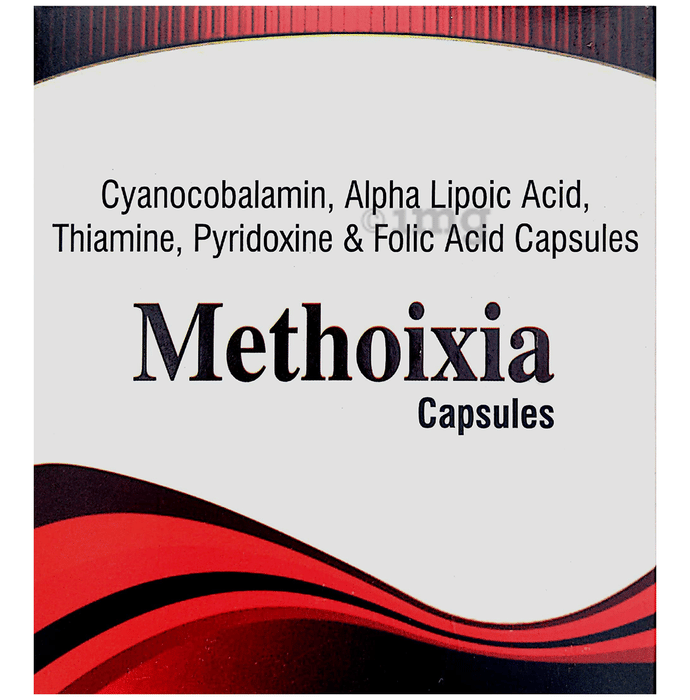 Methoixia Capsule is a dietary supplement that contains cyanocobalamin, alpha lipoic acid, thiamine, pyridoxine, and folic acid. It is intended to help support nerve wellness, cellular health, and energy metabolism as part of a daily nutrition routine. Methoixia Capsules can be used by adults looking to help maintain optimal nutrition and vitality for everyday activities.