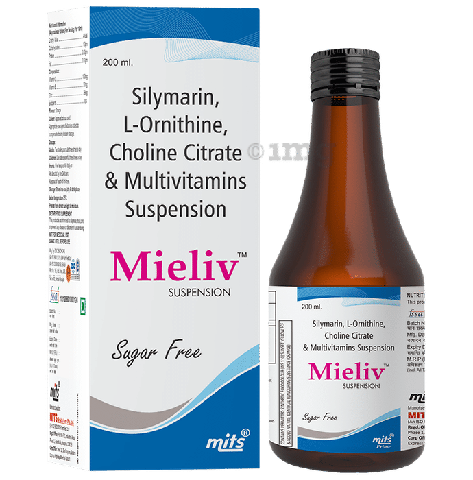 Mieliv Oral Suspension Sugar Free is a potent syrup formulated to support liver health and overall well-being. It is enriched with Silymarin, a powerful antioxidant that helps liver regeneration, and L-Ornithine, which assists in detoxification, this supplement promotes optimal metabolic function. While a blend of essential multivitamins boosts immunity and energy levels. It is designed for those seeking a sugar-free health solution, Mieliv ensures you receive vital nutrients without compromising on taste or efficacy. It is ideal for maintaining vitality and supporting key bodily functions.