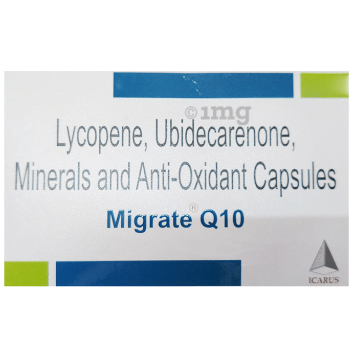 Migrate Q 10 Tablet contains Coenzyme Q10, Lycopene, L-Arginine, N-AcetylCystine, Selenium, Zinc and Piperine as major ingredients.
