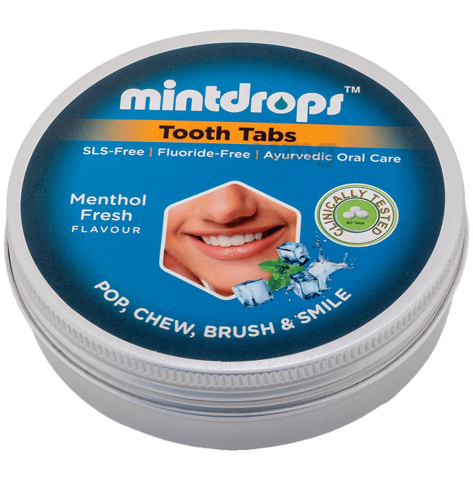 Mintdrops Tooth Tabs Tablet Menthol is an Ayurvedic oral care formulation designed as a convenient alternative to toothpaste. Each tab is SLS-free, fluoride-free, and microplastic-free, offering a cleaner and more sustainable option for daily oral hygiene. With ingredients such as guava leaf, babool stem bark, neem leaf, clove flower bud, and menthol crystals, the formulation can support gum strength, freshness, and overall oral cleanliness. The compact design makes it suitable for both daily use and travel, combining ease of use with Ayurvedic oral care principles.