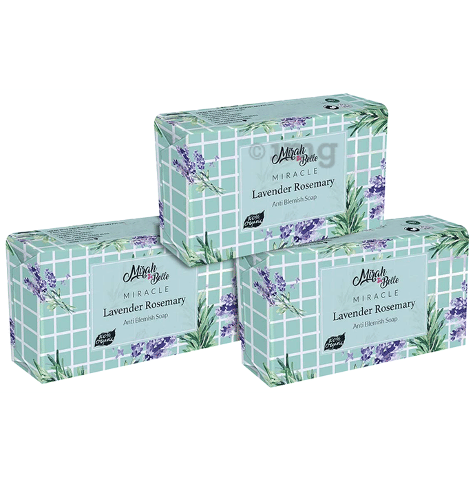 Mirah Belle Lavender Rosemary Miracle Soap (125gm Each) is formulated with lavender and rosemary, which can help reduce the appearance of blemishes and acne. Lavender has anti-bacterial properties, calming skin infections, healing irritation, and improving skin tone. It is also anti-inflammatory which may reduce redness and inflammation caused by acne. Rosemary is an astringent and may help improve the texture of the skin and control sebum production. The fragrance of rosemary can help calm and relax.