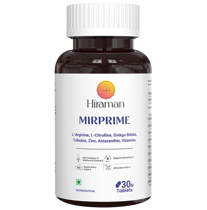 Hiraman Mirpine Tablet is a nutraceutical supplement formulated with a blend of amino acids, antioxidants, and essential vitamins. It may help support blood circulation, cardiovascular health, stamina, and overall energy levels. With ingredients like L-Arginine, L-Citrulline, Ginseng, Coenzyme Q10, and Astaxanthin, it may help contribute to vascular function, endurance, and cellular health.