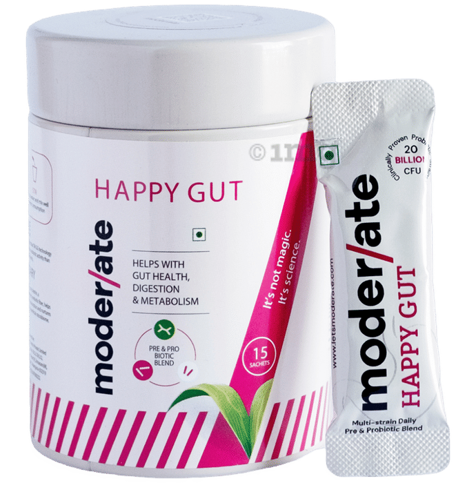 Moderate Happy Gut Sachet is a probiotic and prebiotic formulation designed to help support digestive health and overall well-being. Each sachet contains 20 Billion CFU from a carefully selected blend of probiotics, including Microbac™ GG, which may help provide 5X more probiotic activity. With the addition of plant-based fibre, this formula may help assist in supporting digestion, metabolism, and gut function. It is sugar-free, gluten-free, and lactose-free, making it suitable for diverse dietary needs.