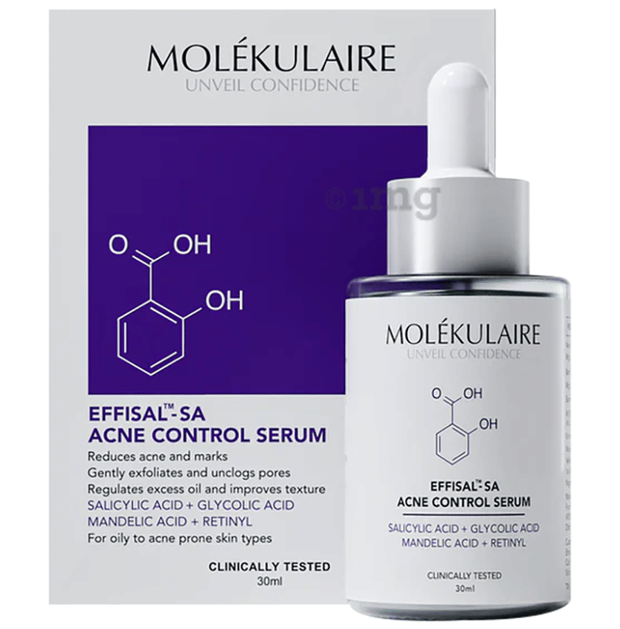 Molekulaire Effisal-SA Acne Control Serum is designed for oily to acne-prone skin types with salicylic acid, glycolic acid, mandelic acid, and retinyl. The serum gently exfoliates and unclogs pores, regulates excess oil, and improves skin texture. It is enriched with fruit extracts and hydrating components that refine the skin surface while maintaining balance. Regular use supports clearer-looking skin by addressing marks, uneven tone, and congestion.