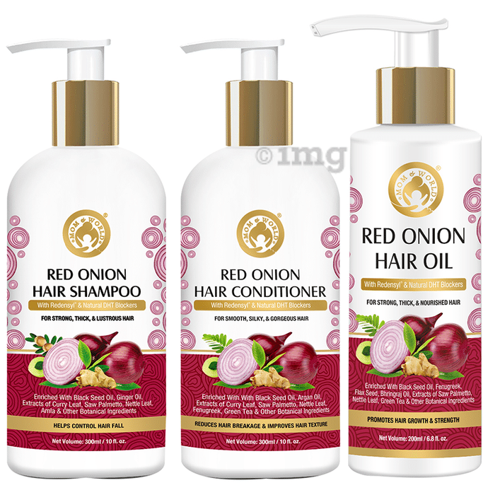 Information about Mom & World Combo Pack of Red Onion Hair Shampoo 300ml, Red Onion Hair Conditioner 300ml & Red Onion Hair Oil 200ml