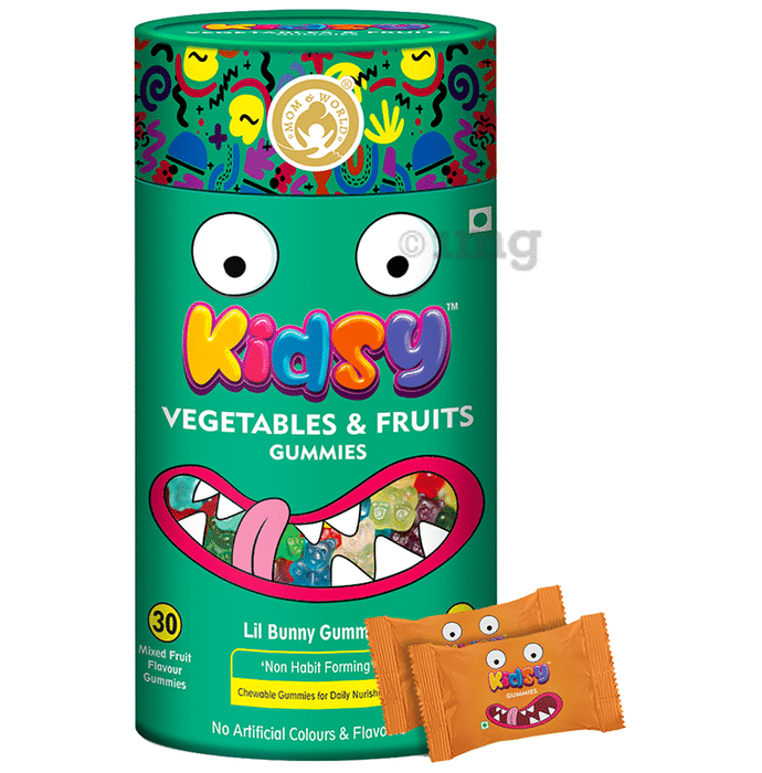 Mom & World Kidsy Vegetables & Fruits Gummies (30 Each) Mix Fruit provide nutritional support for the wellness and active lifestyle of the little one. It has natural ingredients rich and comprises spinach beetroot and other wholesome fruits and vegetables.