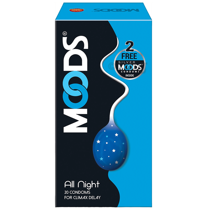 MOODS Condom All Night are parallel-sided, lubricated male latex condoms made from natural rubber latex. These condoms contain a specially formulated ingredient to provide protection. Designed to support safe intimacy, this product can also enhance the overall experience.