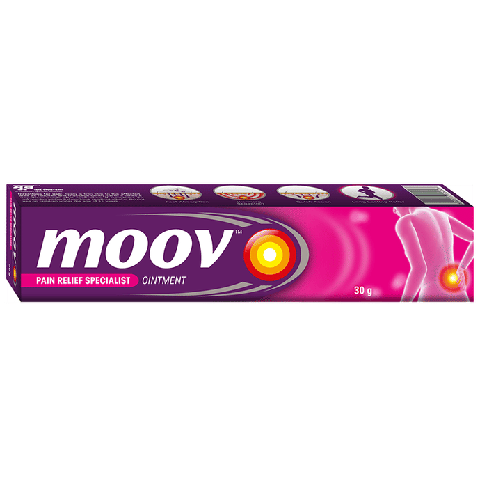 Moov Pain Relief Ointment for Back Pain, Joint Pain, Knee Pain, Muscle Pain is a 100% Ayurvedic formulation which may help provide fast and effective relief from muscle pain, backache, joint pain, sprains, and inflammation. Made with a soothing blend of Turpentine Oil, Nilgiri Oil, Wintergreen Oil and Mint Extract swiftly penetrate the targeted area of pain giving you a soothing effect and instant relief. Moov Pain Relief Ointment is one of India's most popular ointments for fast pain relief amongst the homemakers. It is an analgesic (or pain relieving) ointment made using 100% ayurvedic ingredients. It may provide fast and long-lasting relief from muscle pain, neck and backache, inflammation, sprain, myositis, fibrositis and sciatica. It's a fast pain relief spray for frozen shoulder and body aches. The quick-absorbing Ointment format makes it convenient for on-the-go applications, potentially offering long-lasting relief and helping reduce inflammation.