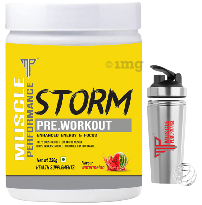 MP Muscle Performance Storm Pre-Workout Powder Watermelon with Steel Shaker is formulated with a blend of ingredients commonly used to support energy levels, endurance, and focus during exercise. It contains beta-alanine, L-arginine, creatine monohydrate, taurine, and L-citrulline, which are associated with muscle endurance and performance. Caffeine anhydrous and black pepper extract are included as stimulants, while vitamins B3 and C play a role in metabolism and antioxidant support. The pack comes with a steel shaker, which may provide a more convenient way to mix and carry the powder as per requirement.