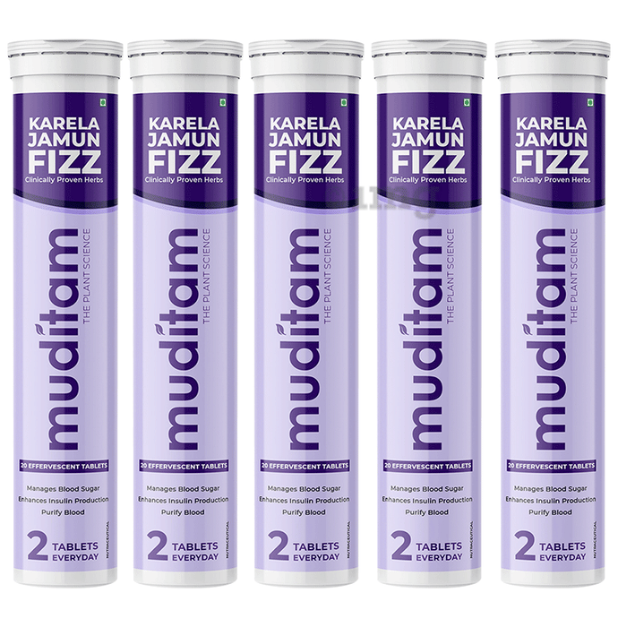 Muditam Ayurveda Karela Jamun Fizz Effervescent Tablets is an Ayurvedic effervescent tablet made with 11 herbs. This fizzy drink combines the benefits of karela without bitterness along with Jamun, neem, gudmar and many such herbs to create a refreshing, anti-oxidant-rich beverage. It includes Ayurvedically inspired herbs backed by modern scientific research and presented in easy-to-consume forms for the new generation.