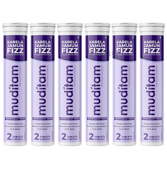 Muditam Ayurveda Karela Jamun Fizz Effervescent Tablets is an Ayurvedic effervescent tablet made with 11 herbs. This fizzy drink combines the benefits of karela without bitterness along with Jamun, neem, gudmar and many such herbs to create a refreshing, anti-oxidant-rich beverage. It combines Ayurvedically inspired herbs backed by modern scientific research and presented in easy-to-consume forms for the new generation.