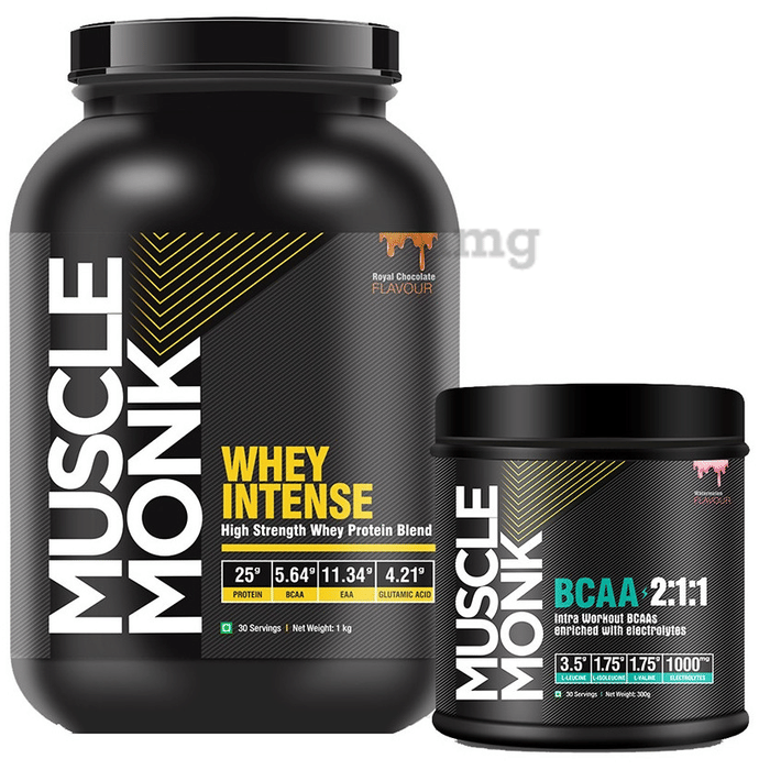 Information about Muscle Monk Combo Pack of Whey Intense High Strength Whey Protein Blend Royal Chocolate 1kg & BCAA 2:1:1 Watermelon 300gm