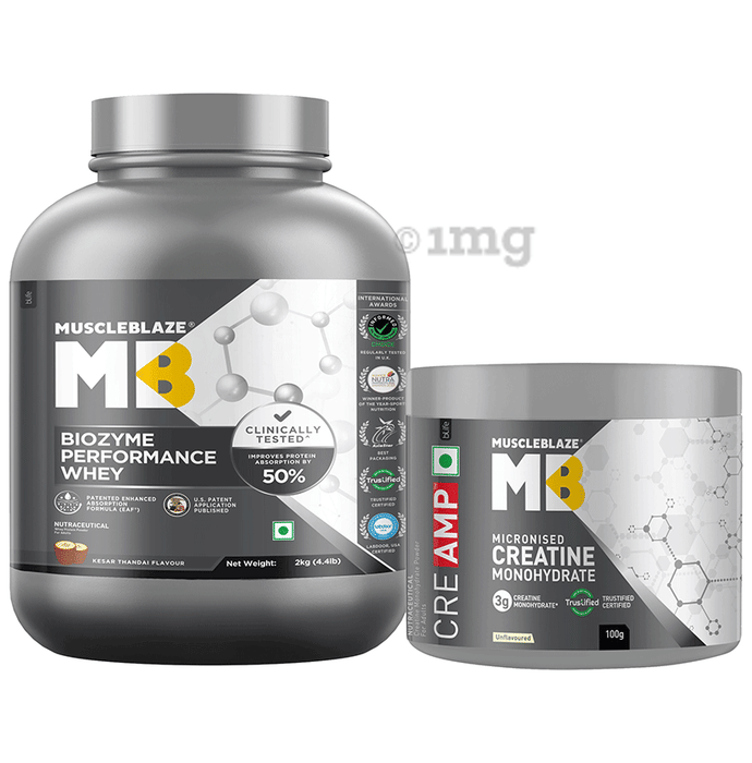 MuscleBlaze Combo Pack of Biozyme Performance Whey Protein Powder Kesar Thandai (2kg) & Creatine Monohydrate Unflavoured (100gm)