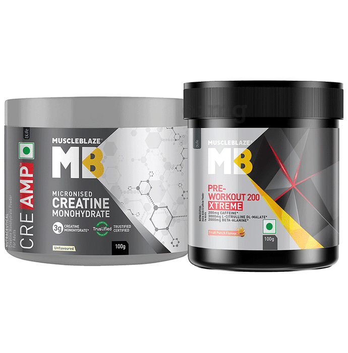 Muscleblaze Combo Pack of Creatine Monohydrate & Pre-Workout 200 Xtreme (100gm Each) Unflavored & Fruit Punch to support athletic performance and energy levels.