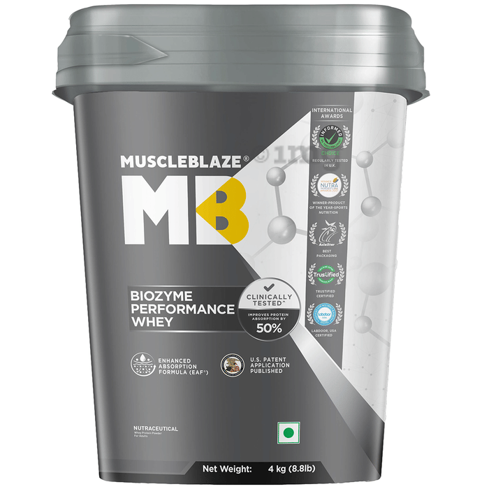 MuscleBlaze Biozyme Performance Whey Protein is a whey protein supplement customized for Indians. It won product of the year in the sports nutrition category at the NutraIngredients Award 2021 in Singapore. It is regularly and rigorously tested by Informed Choice Program U.K. after monthly blind sampling from the market. It has been rigorously tested and certified by Labdoor, USA for Accuracy of Claims (Protein content, no amino spiking) and purity (free from heavy metals or biological contaminants).