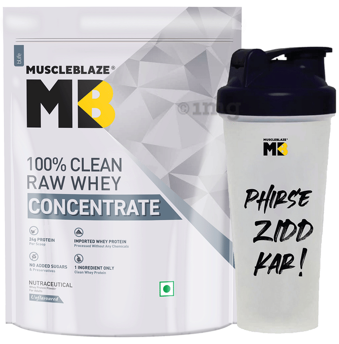 MuscleBlaze Raw Whey Protein 80% Powder Unflavored with Shaker is enriched with added digestive enzymes and may benefit post-workout muscle recovery. Every 30 grams serving contain 24 grams of protein, 5.2 grams of naturally occurring BCAAs, and 11.2 grams EAAs. The minimal processing ensures the nutrients of whey protein concentrate are preserved in their original form. The added digestive enzymes help with digestion to get the maximum benefit of the protein. The shaker bottle has a 650ml capacity and comes with a blender ball. It is made from safe, durable, and BPA-free plastic. The mixing ball ensures lump-free protein and BCAAs supplement shakes.