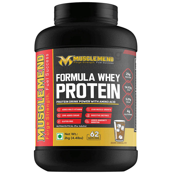 Musclemend Formula Whey Protein Dark Chocolate is a protein supplement crafted with a blend of whey protein concentrate and whey protein isolate. Each serving provides 25g of protein, with a comprehensive amino acid profile including essential amino acids and BCAAs. The addition of digestive enzymes supports the breakdown of nutrients during digestion. The formula is processed using multi-phase filtration technology to maintain protein quality and is free from gluten and added sugar. Sweetened with a blend of stevia glycoside and sucralose, it is suitable for those monitoring their sugar intake. This product is designed for adults and should be used in conjunction with a balanced diet and physical training.