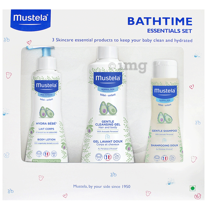 Mustela Bath Time Essential Set includes 3 products Mustela Gentle Cleansing Gel, Mustela Gentle Shampoo and Mustela Hydra Bebe Body Lotion plant-based skin care products to keep your baby clean and moisturised during and in between baths. Each product is formulated with avocado perseose, a patented, natural ingredient specifically formulated to help protect and hydrate your baby's delicate skin.