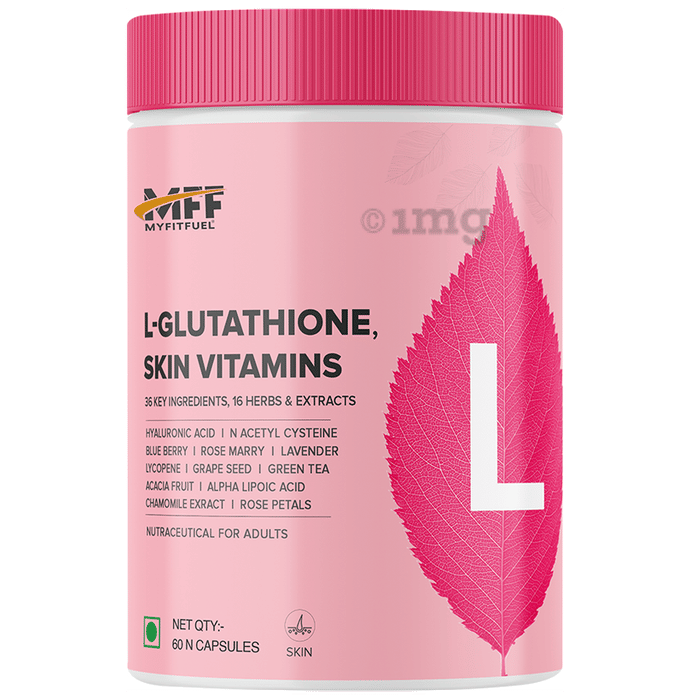 MyFitFuel L-Glutathione Skin Vitamins Capsules is a nutraceutical supplement containing vitamins, minerals, antioxidants, and herbal extracts. It is designed as a no-added-sugar, trans-fat-free option that may help support healthy-looking skin, maintain hydration, and contribute to overall skin wellness as part of daily nutrition.