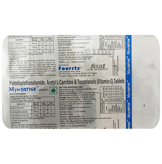Myo Fatige Tablet is a combination medicine used to manage neuromuscular pain, muscle fatigue and cramps. Palmitoylethanolamide is a pain-relieving medicine. It works by blocking the actions of certain chemicals within the body that causes pain and inflammation. Acetyl-L-Carnitine is an amino acid that strengthens your muscles and prevents muscle fatigue. It also rejuvenates nerve cells, protects it from getting damaged further and restores nerve function.