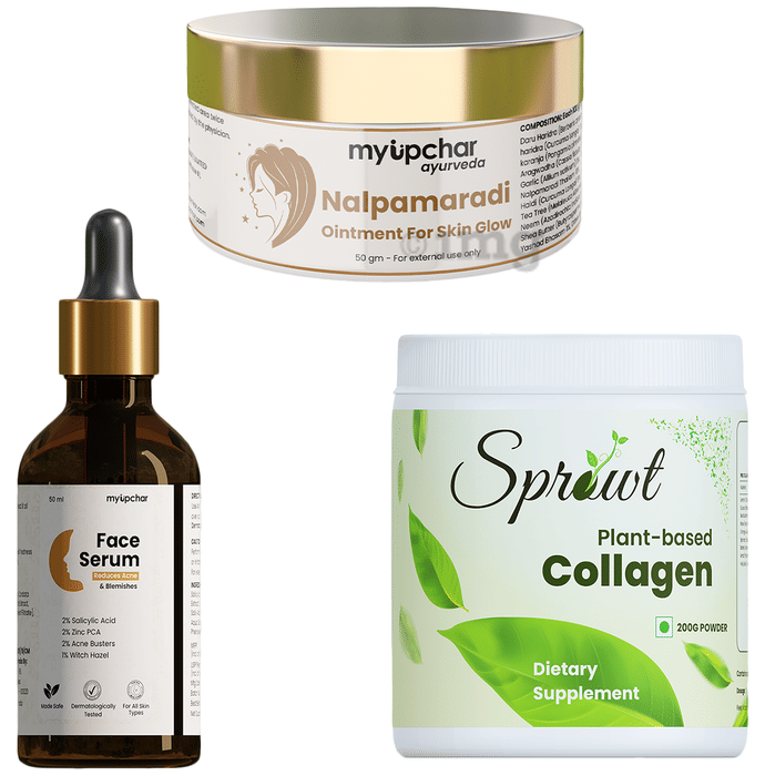 Information about Myupchar Ayurveda Combo Pack of Nalpamaradi Ointment for Skin Glow (50gm), Face Serum Reduces Acne & Blemishes (50ml) and Sprowt Plant Based Collagen Powder (200gm)