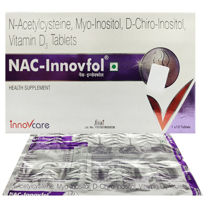 Nac-Innovfol Tablet contains N-Acetyl Cysteine, Myo-inositol, D-Chiro-inositol and Vitamin D3 as active ingredients. Polycystic ovary syndrome (PCOS) is a common endocrine disorder which remains poorly understood. Nac-Innovfol Tablet is a combination of agents that may favorably improve fertility rate among infertile women or women with PCOS.