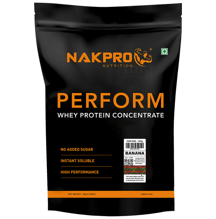 Nakpro Nutrition Perform Whey Protein Concentrate for Muscle Recovery / No Added Sugar / Flavour Banana is a nutraceutical formulation containing instantized whey protein concentrate designed to support daily protein requirements during fitness and active routines. As a fast-absorbing protein source, it helps supply amino acids quickly to support muscle recovery, lean mass maintenance, and general post-workout nutritional needs. The formulation is instant-soluble, contains no added sugar, and is crafted to mix smoothly with water or milk.