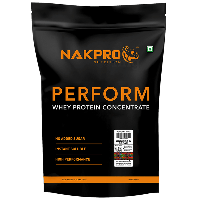 Nakpro Nutrition Perform Whey Protein Concentrate for Muscle Recovery / No Added Sugar / Flavour Cookies and Cream is a nutraceutical formulation containing instantized whey protein concentrate designed to support daily protein requirements during fitness and active routines. As a fast-absorbing protein source, it helps supply amino acids quickly to support muscle recovery, lean mass maintenance, and general post-workout nutritional needs. The formulation is instant-soluble, contains no added sugar, and is crafted to mix smoothly with water or milk.