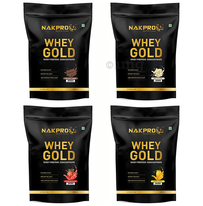 Nakpro Nutrition Whey Gold Whey Active Concentrate Powder (500gm Each) Chocolate, Mango, Strawberry & Vanilla