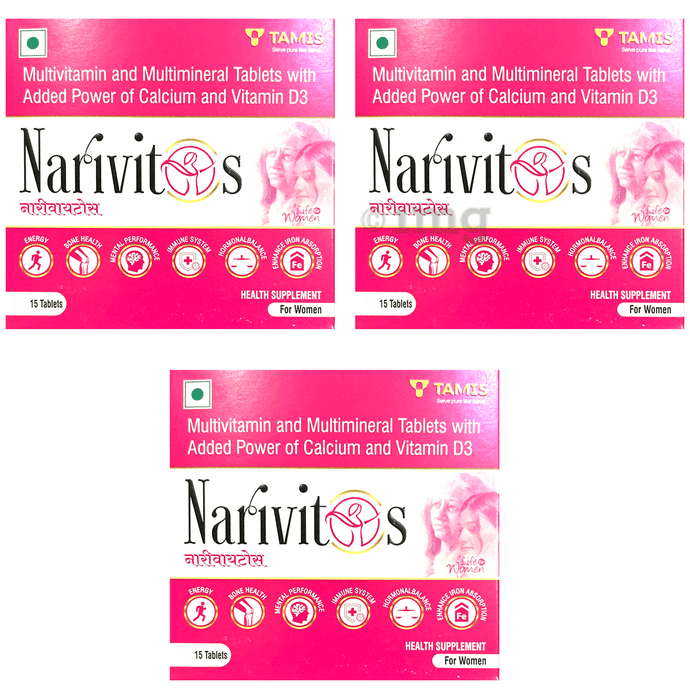 Narivitos Tablet is a health supplement formulated with a blend of essential vitamins, minerals, and added calcium and Vitamin D3. Designed for women, this supplement contains key nutrients that may help support overall wellness when consumed as part of a balanced diet. It includes Iron and Folic Acid, which are important for meeting daily nutritional requirements. The formulation also contains Magnesium, Zinc, and Beta-Carotene, which contribute to natural immune defense mechanism in the body.