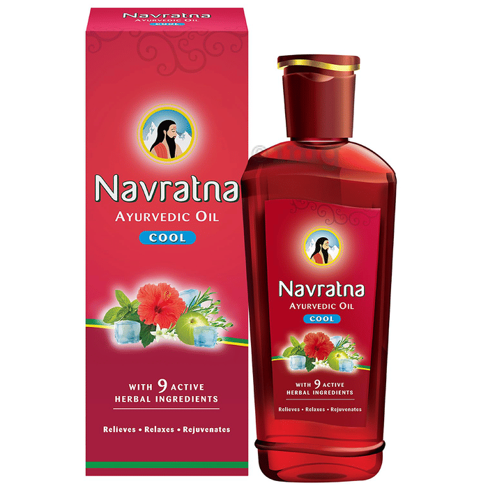 Navratna Cool Ayurvedic Oil is a multi-benefit cooling oil enriched with herbal extracts. It is used for head and body massage and is effective for both men and women. A massage with Navratna oil relaxes the muscles. It imparts a cooling effect on the scalp and body. It also relieves tension and improves blood circulation. It is easily absorbed by massaging the scalp and provides a soothing effect.