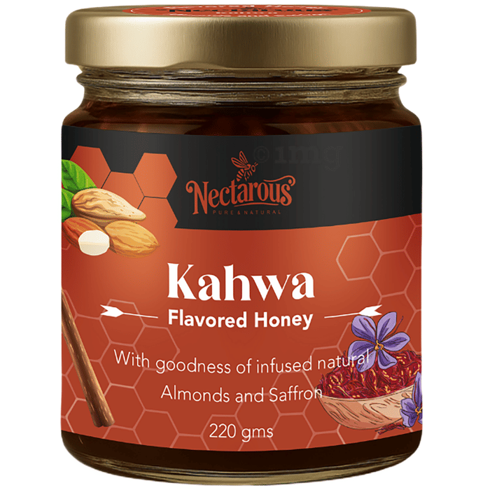 Nectarous Pure & Natural Kahwa Flavoured Honey combines multiflora honey with almonds, rose, kahwa tea, and spice extracts of cinnamon, cardamom, and saffron. The aromatic profile adds a rich, nutty-saffron taste to warm beverages and simple recipes. As part of daily diet, it may help support digestive comfort and offer a pleasant soothing experience for the throat.
