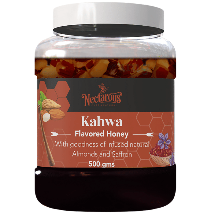 Nectarous Pure & Natural Kahwa Flavoured Honey combines multiflora honey with almonds, rose, kahwa tea, and spice extracts of cinnamon, cardamom, and saffron. The aromatic profile adds a rich, nutty-saffron taste to warm beverages and simple recipes. As part of daily diet, it may help support digestive comfort and offer a pleasant soothing experience for the throat.