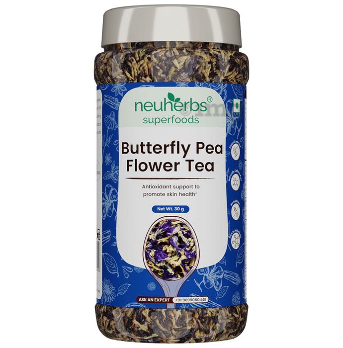 Neuherbs Butterfly Pea Flower Tea is a premium herbal tea crafted from the vivid blue petals of Clitoria ternatea, renowned for its natural antioxidant properties and vibrant color. This caffeine-free, natural tea provides a refreshing, flavorful experience with floral undertones that soothe the senses. The teas visually striking deep blue color and mild, calming taste make it an ideal addition to your wellness routine, offering more than just a beverage – its a holistic experience that nurtures both body and mind. Butterfly Pea Flower Tea is traditionally used to support overall skin health, mental health, and hydration. It is also revered for its ability to assist with inflammation, making it an excellent option for those seeking to calm their body while indulging in a moment of peace and relaxation.