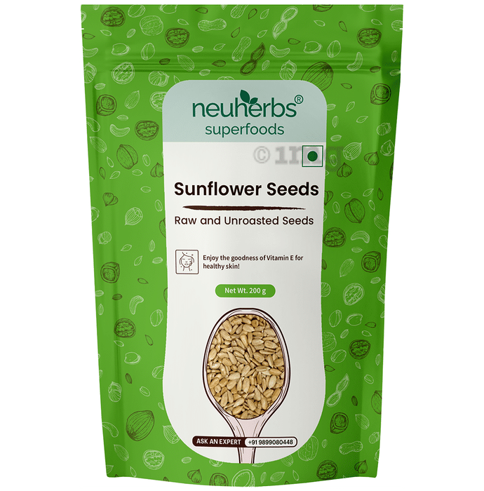 Neuherbs Sunflower Seeds contains dietary fibre, protein and is loaded with essential micronutrients and has cholesterol. Sunflower seeds have a large amount of dietary fibre that helps bulk up stool and promotes peristaltic motion. Sunflower seeds are rich in B complex vitamins, which are essential for a healthy nervous system. It is without preservatives, chemicals, artificial flavor, and color.
