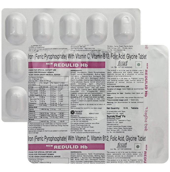 New Redulid Hb Tablet is a formulation containing vitamin C, iron, folic acid, vitamin B12 and other vital agents intended as a nutritional supplement.