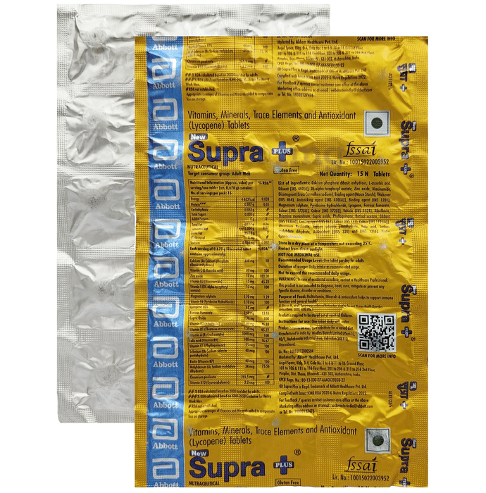 New Supra Plus Tablet Gluten Free is a nutraceutical tablet that provides essential nutrients to the body. It is indicated for general weakness, convalescence, and overall well-being. The tablet is designed to boost immunity and promote overall health in adults.